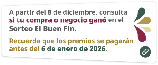 | 8 de diciembre de 2025 | Los listados de los tarjetahabientes y comercios ganadores serán publicados en el minisitio electrónico del Sorteo El Buen Fin 2025, que será localizado en los Portales oficiales https://www.gob.mx/sorteoelbuenfin y https://www.sat.gob.mx |